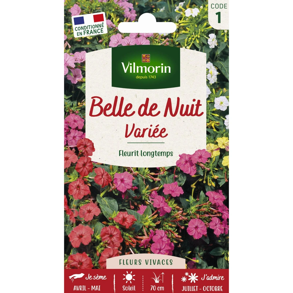 La Belle de Nuit Variée (Mirabilis jalapa) est une plante annuelle buissonnante et vigoureuse, particulièrement appréciée pour son originalité biologique : ses fleurs ne s'ouvrent qu'en fin de journée ou par temps couvert, libérant un parfum suave et envoûtant durant toute la nuit.