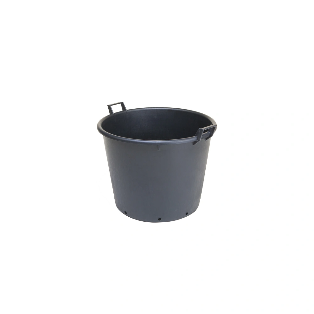 Conteneur PE drainé noir 90 L (D60 x H46 cm), poignées ergonomiques charges 80-90 kg, trous drainage multiples anti-stagnation. HDPE renforcé UV/gel/chocs (-25 deg C), alimentaire recyclable ; volume idéal arbres ornementaux/conifères (racines 40-50 cm). B2B pépinières : culture professionnelle (drainage naturel), empilable haute pile (8-10 unités), transport sécurisé palettes ; poids ~3,2 kg vide. Fabrication FR robuste économique.