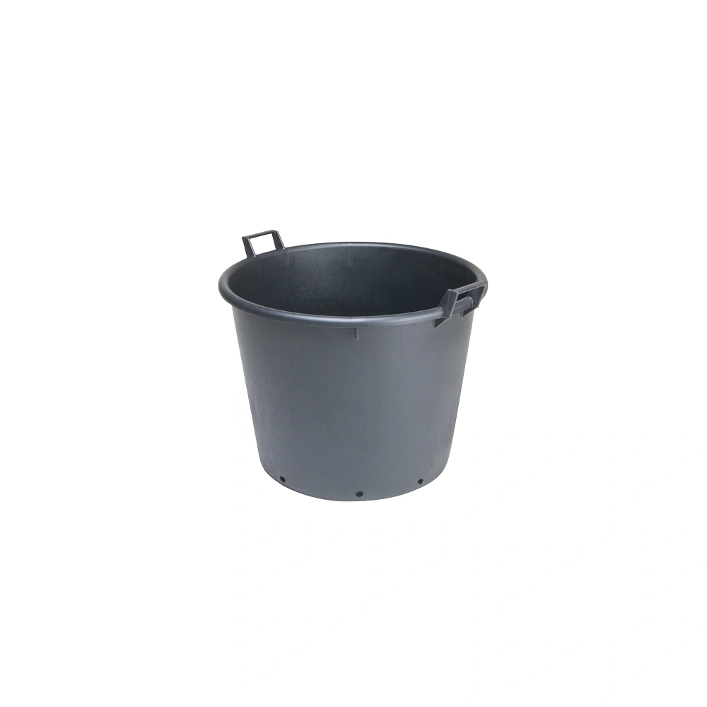 Grand conteneur PE noir non drainé 110 L (D65 x H50 cm), poignées intégrées ergonomiques pour manipulation charges jusqu'à 100 kg (arbustes matures, plants forestiers). Polyéthylène haute densité recyclable, épaisseur renforcée anti-chocs/UV/gel (-20 deg C/+50 deg C), alimentaire norme UE pour substrats propres. Pro B2B pépinières/serres : culture racines libres (fruitiers, conifères 3-5 ans), empilable stockage (gain 70% espace), transport palettes ; sans trous fond pour bassins hydro (option perceuse). Fabrication française robuste, poids vide ~3,5 kg.