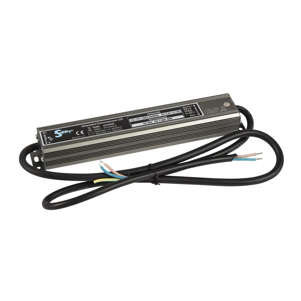 Convertisseur électronique 30W IP66 24VDC, conçu pour alimenter les projecteurs et luminaires fonctionnant en 24V. Boîtier étanche IP66 pour une utilisation en extérieur.