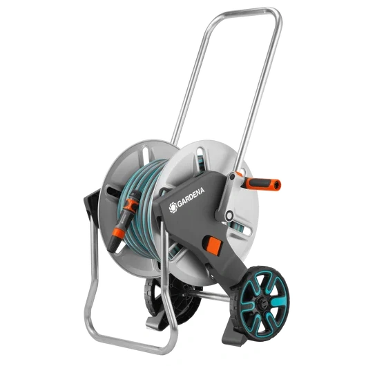 Stabilité maximale (Kick&Stand) : Le support escamotable assure une stabilité parfaite lors du déroulage. Le dévidoir reste en place même si vous tirez fermement sur le tuyau.