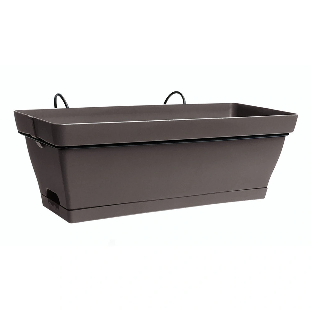 Ensemble jardinière Romeo, dimensions 48,5 x 20,5 x 17 cm, couleur taupe, avec soucoupe et support. Produit esthétique et pratique, idéal pour les professionnels de l'horticulture et du jardinage.