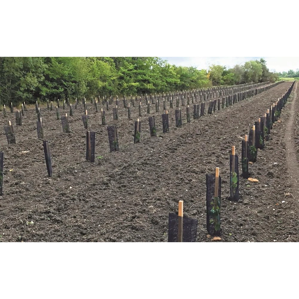 Protection mécanique des jeunes arbres : gaine grillagée noire de 1,20 m. Elle forme une barrière infranchissable pour les chevreuils et lapins, empêchant l’écorçage destructeur des jeunes plants forestiers ou fruitiers.