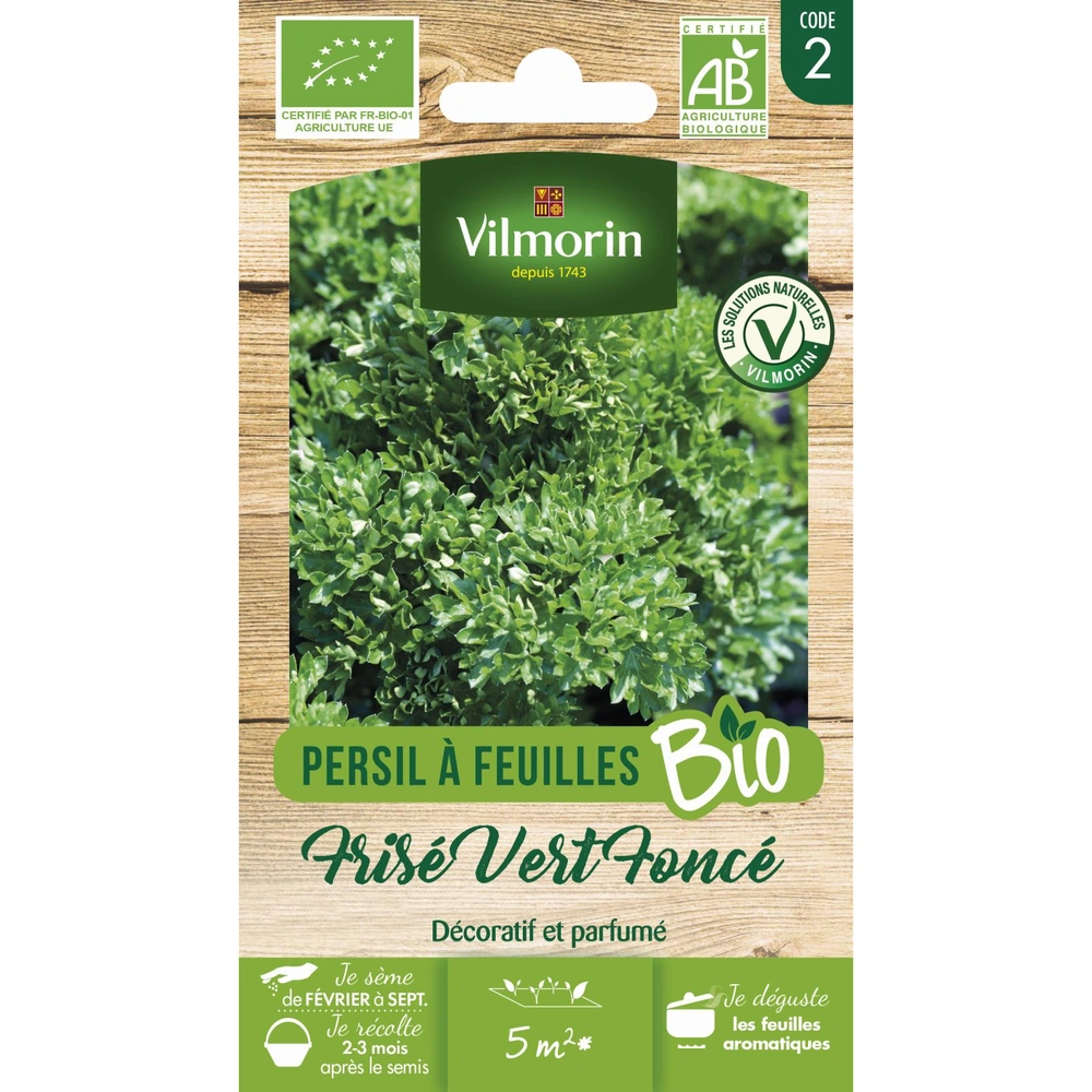 Le Persil Frisé Vert Foncé (Petroselinum crispum) est une variété horticole sélectionnée pour la densité et la couleur intense de son feuillage. Certifiée Agriculture Biologique, cette variété Vilmorin se distingue par des feuilles très découpées, frisées et d'un vert profond, offrant une présentation visuelle élégante tant au jardin que dans l'assiette. Très aromatique, il est indispensable pour les garnitures et l'assaisonnement.