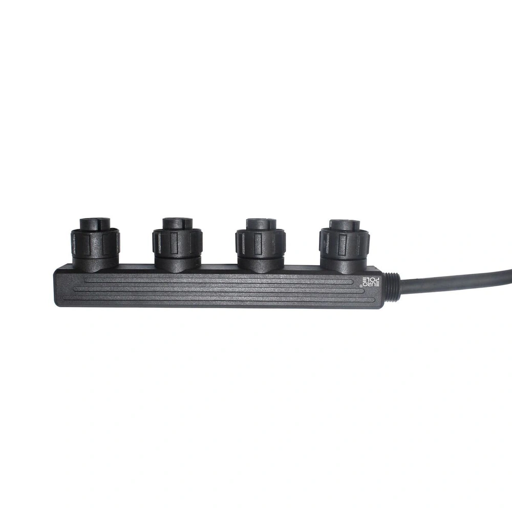 Répartiteur à 4 sorties 3 pôles IP67, permettant de connecter jusqu'à quatre appareils ou luminaires à une seule source d'alimentation, tout en assurant une protection contre les projections d'eau et la poussière. Idéal pour les installations d'éclairage extérieur complexes.