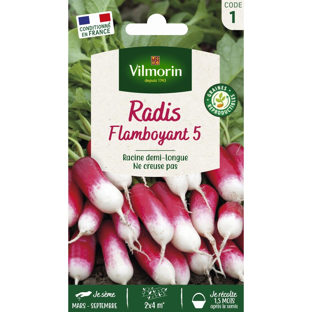 Le Radis Flamboyant 5 est une variété horticole de référence, sélectionnée pour sa rapidité de croissance et ses qualités gustatives. Ce radis demi-long, d'une couleur rouge vif éclatante se terminant par un petit bout blanc très net, offre une chair ferme, croquante et particulièrement savoureuse. Idéal pour les cultures printanières et automnales, il se distingue par sa résistance et sa facilité de culture.