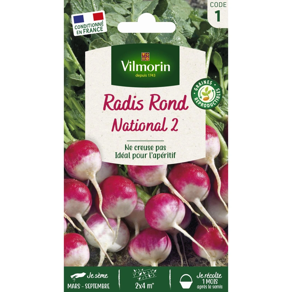 Le Radis National 2 (Raphanus sativus) est une variété traditionnelle incontournable pour tout potager. Ce radis se distingue par sa racine ronde à la robe bicolore séduisante : un rouge vermillon vibrant qui se fond délicatement dans une base d'un blanc pur. Reconnu par les experts pour sa grande qualité gustative, il offre une chair tendre, croquante et surtout une saveur douce qui a l'avantage de ne pas devenir piquante, même en cas de récolte légèrement tardive. 🌿